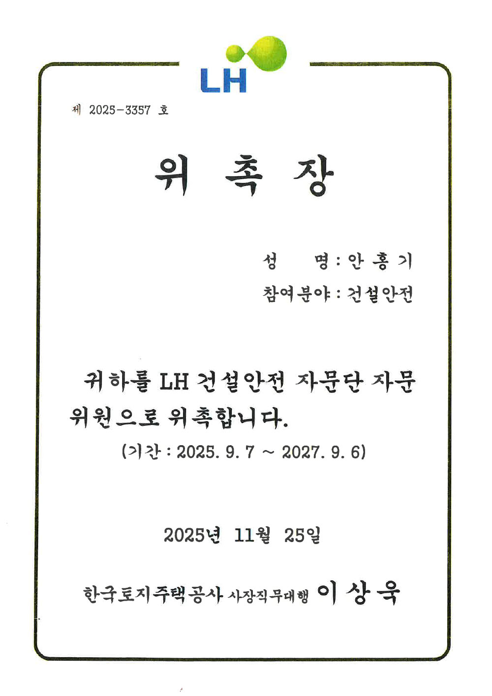 LH건설안전 자문단 자문위원 위촉장